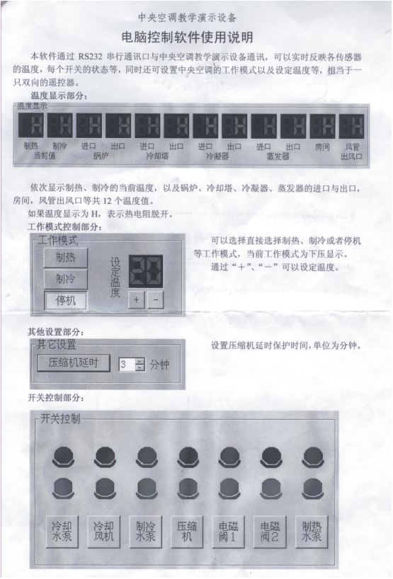 為了更好地滿足各大院校的教學(xué)需要,在原來開發(fā)的中央空調(diào)實驗設(shè)備的基礎(chǔ)上,配備了RS-232串行通訊接口,可直接與電腦連接,由電腦控制軟件控制整個實驗臺的運(yùn)行,包括:總控臺啟動、制冷、制熱、冷卻水泵、冷卻風(fēng)機(jī)、制冷水泵、壓縮機(jī)、電磁閥、制熱水泵做演示,制冷、制熱的溫度設(shè)定等。