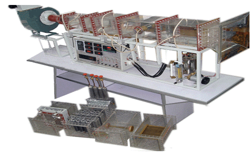 風機,自動調(diào)節(jié)風門,組合式有機玻璃風洞,有機玻璃實驗管段,有機玻璃叉排、順排實驗段,旋轉圓柱試件,紫銅平板試件,穩(wěn)壓電源配電位器調(diào)節(jié)加熱功率,電流表,電壓表,畢托管及差壓傳感器,PT100熱電阻測溫,巡檢儀顯示溫度、阻力、流量,不銹鋼臺架等。