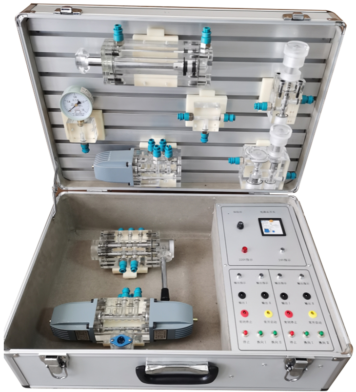 3、箱子集元件元件、液壓泵站、調(diào)速電機及電氣控制部分為一體箱,教師可方便的將設(shè)備帶入課堂進行現(xiàn)場演示教學和實物講解。
