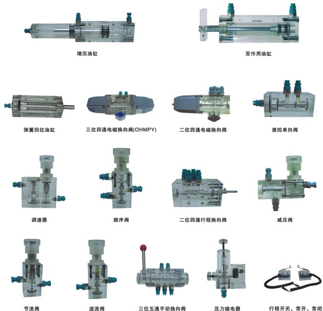 4、實驗元件均為透明有機材料制成,便于了解掌握幾十種常用液壓元件的結構,性能及用途。掌握幾十種基本回路的工作原理,實驗組裝回路快捷、方便。